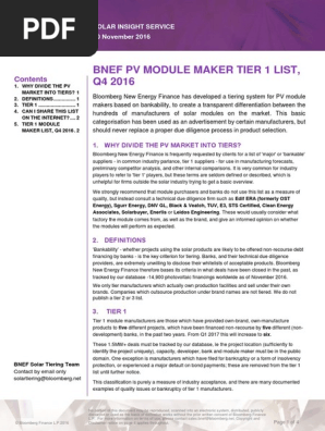 Bloomberg new energy finance contents solar insight service 9 november 2015 bnef pv module maker tier 1 list q4 2015 bloomberg new energy finance has developed a tiering system for pv module makers based on bankability to create a transparent differentiation between the hundreds of manufacturers of solar modules on the market.